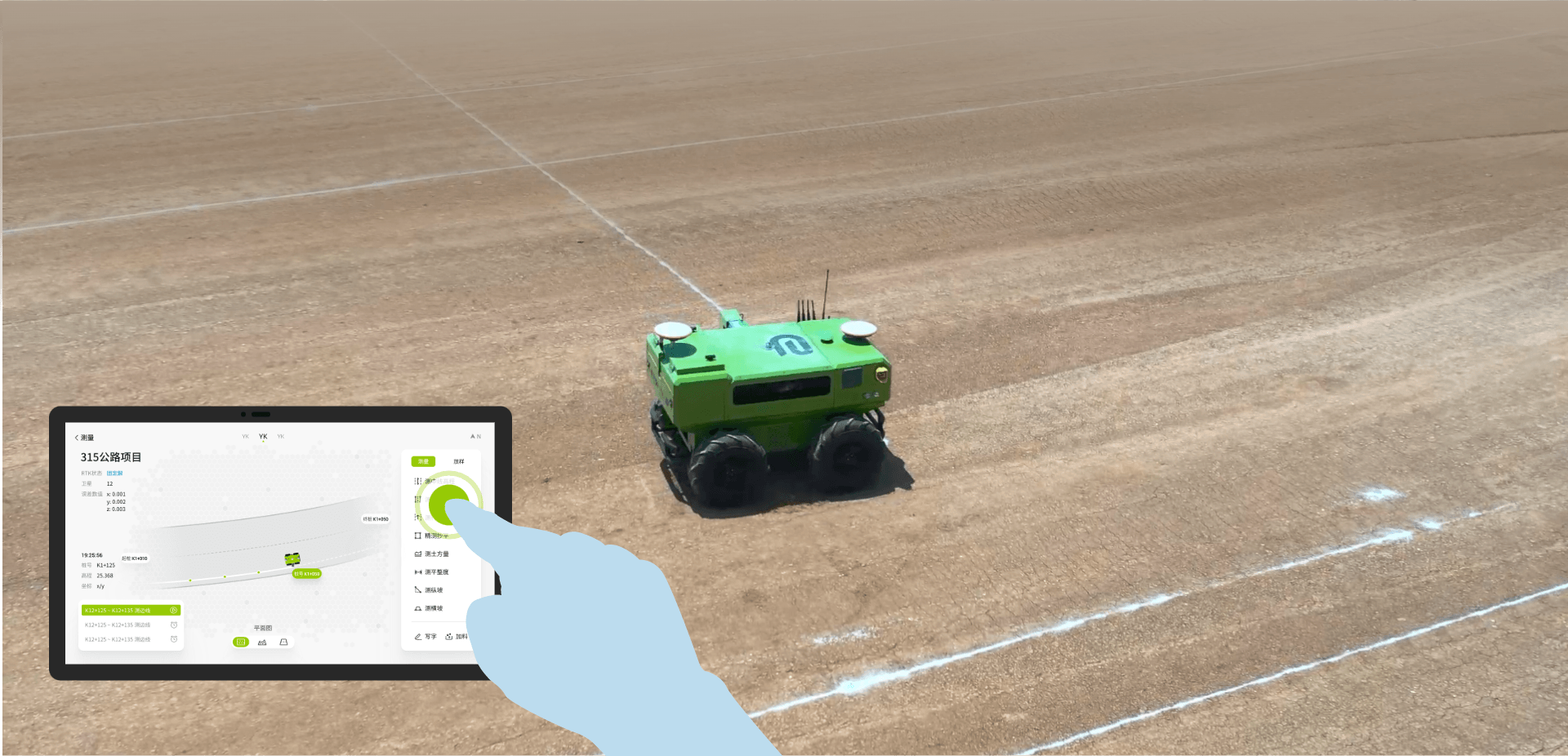 无矩是一款能够自动进行道路测量、标记、划线的智能测量机器人,主要服务于路基施工填筑、 开挖环节中涉及的边桩、中桩、高程控制,精准抄平、管涵开挖等测量放样环节,通过高效、精准的测量和放样,提高整体施工效率和质量。